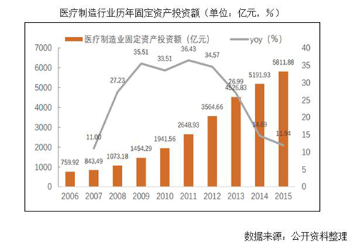 与此同时,另一方面,GMP、FDA等标准持续提升,企业需要不断改进更新生产条件。因此,近年来,制药企业纷纷引入自动化控制系统,加大对固定资产的投资规模。数据显示,2006~2016年间,我国医疗制造业固定资产投资额保持快速增长,2006年仅为759.92亿元,而到了2016年,已增长至5811.88亿元,年复合增长率超过25%。