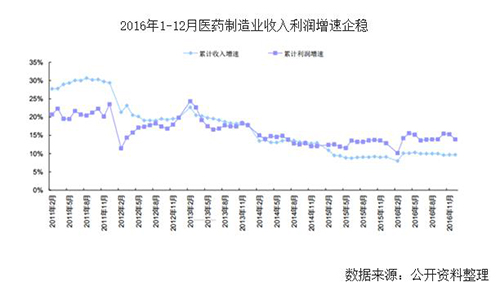 2016年中国医药制造业收入利润增速较2015年略有提升,2016年1-12月,医药制造业主营业务收入28062.9亿元,同比增长9.7%,较2015年增速(9.1%)略有提升,医药制造业利润总额3002.9亿元,同比增长13.9%,同样较2015年增速(12.9%)回升。