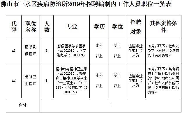 因工作需要,佛山市三水区疾病防治所面向社会公开招聘工作人员,特公告如下: