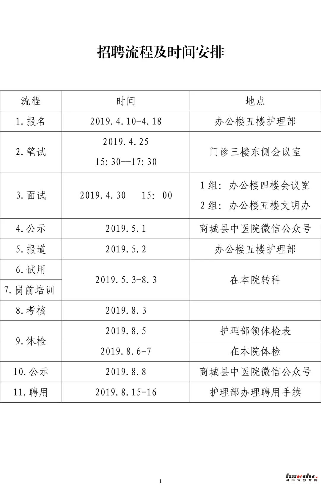 七、体检 录用人员接到体检通知后于2019年8月5日到护理部领取体检表,8月6日-7日体检;体检对象放弃体检或因体检不合格出现招聘岗位缺额的,按试用期考核成绩从高分到低分依次等额递补。