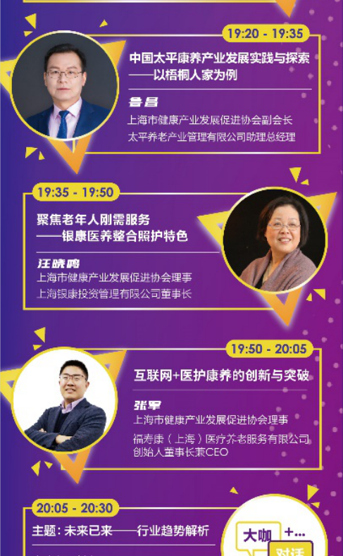 由从事老龄工作30年的殷志刚先生为您带来中国式养老服务现状及未来发展态势—基于上海的实践和后疫情时期的思考;引进国际5H先进理念,高端养老服务的领军企业—太平养老产业管理有限公司鲁昌助理总经理,将以梧桐人家为例介绍中国太平康养产业发展实践与探索;聚焦老年人刚需服务,城市社区养老典范企业银康医养,将由汪晓鸣董事长来分享以老年人为中心全生命周期的整合照护特色服务;居家医养服务的卓越代表福寿康的张军董事长,将深化解读互联网+医护康养的创新与突破等大众民生关注的热门话题。更有神秘嘉宾担任主持,论坛同期辅以精彩的问答环节,参与直播互动、答疑解惑的同时还有机会获赠精美礼品!