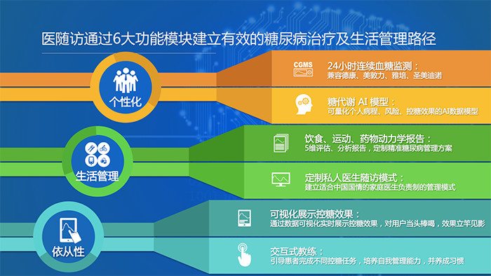 杨枫进一步解释说,医随访的核心是糖代谢动力学检测,它是一种将糖尿病视为糖代谢紊乱状况下的表现,也是对糖尿病病人整体能量需求和营养均衡下的整体管理。它将患者的数据预处理后,得到个人独特的升糖曲线恢复周期。通过对此进行的分析能够评估患者的控糖情况,从而确定用药方案。