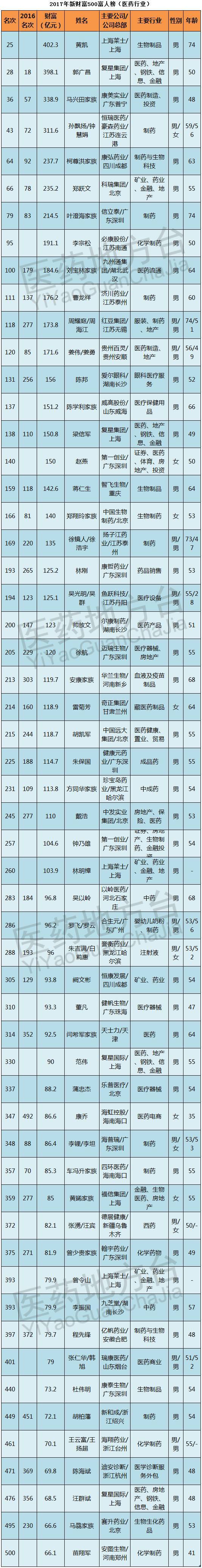 其中,排名前三的分别是黄凯(上海莱士)、郭广昌(复星集团)、马兴田家族(康美实业),财富值分别是402.3亿元、398.1亿元、338.9亿元。