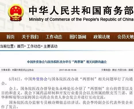 来自商务部的消息,5月8日,中国外资协会与国务院医改办就“两票制”相关问题举行了沟通会。