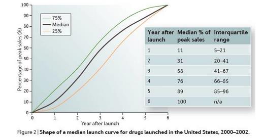 鉴于以上原因,SethRobey和FrankS.David统计了从2000-2002年被FDA批准的70个处方药的历年销售数据,基于人口增长进行了修正并归一化为峰值单位销售。在去除了异常曲线后,对剩余61个覆盖广泛药理作用机制和治疗领域的上市药物进行了分析。