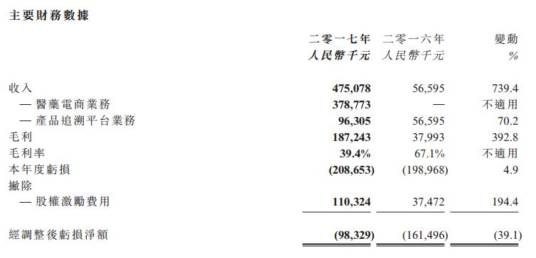 根据5月17日阿里健康发布的2017年度的业绩报告显示,截至2017年3月31日止年度,阿里健康录得收入4.751亿元(人民币,下同),毛利1.872亿元,毛利率为39.1%,同比分增长739.4%和392.8%,而该公司经调整亏损净额同比大幅下降39.1%至9833万元。而此次业务的注入,则意味着阿里健康将逐步走向盈利,形成自身造血功能,当然这与背靠“阿里爸爸”存在相当关系。