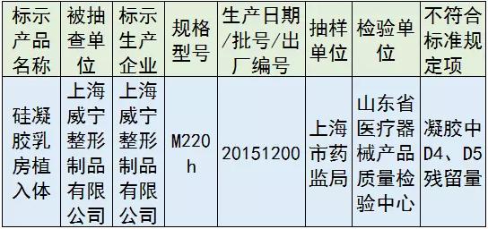 其中,上海威宁整形制品有限公司生产的1批硅凝胶乳房植入体,凝胶中D4、D5残留量不符合标准规定。