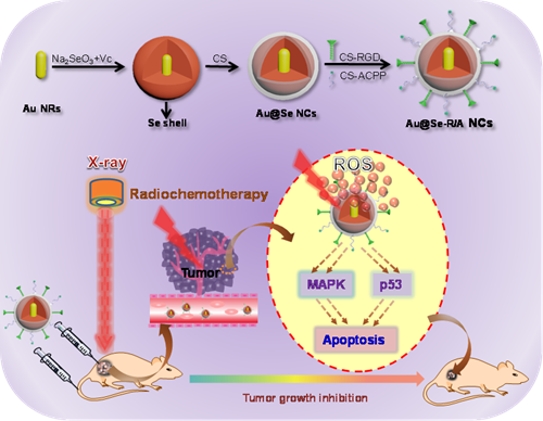 研究团队通过整合金纳米棒的放射增敏特性和硒纳米颗粒的抗肿瘤活性,设计出核壳结构的金/硒纳米复合体系,并将表面修饰双靶向分子作为一种新型的纳米放疗增敏剂,实现肿瘤靶向的放化疗法。该纳米复合体系表现出优秀的肿瘤靶向能力、良好的生物安全、高效的放疗增敏作用和显著的抗肿瘤效果。机制研究表明:该纳米放疗增敏剂和X射线联合应用能够通过死亡受体途径诱导肿瘤细胞凋亡并促进ROS过量产生,从而激活下游ROS介导的信号通路,大大提高抗肿瘤活性。这项研究为肿瘤靶向放化疗提供了一种有效的临床可行的技术。