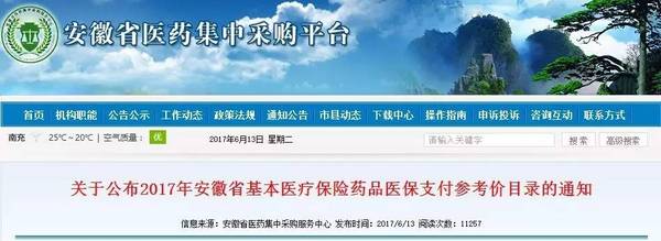 6月13日,安徽省医药集中采购平台公布《2017年安徽省基本医疗保险药品医保支付参考价目录》。