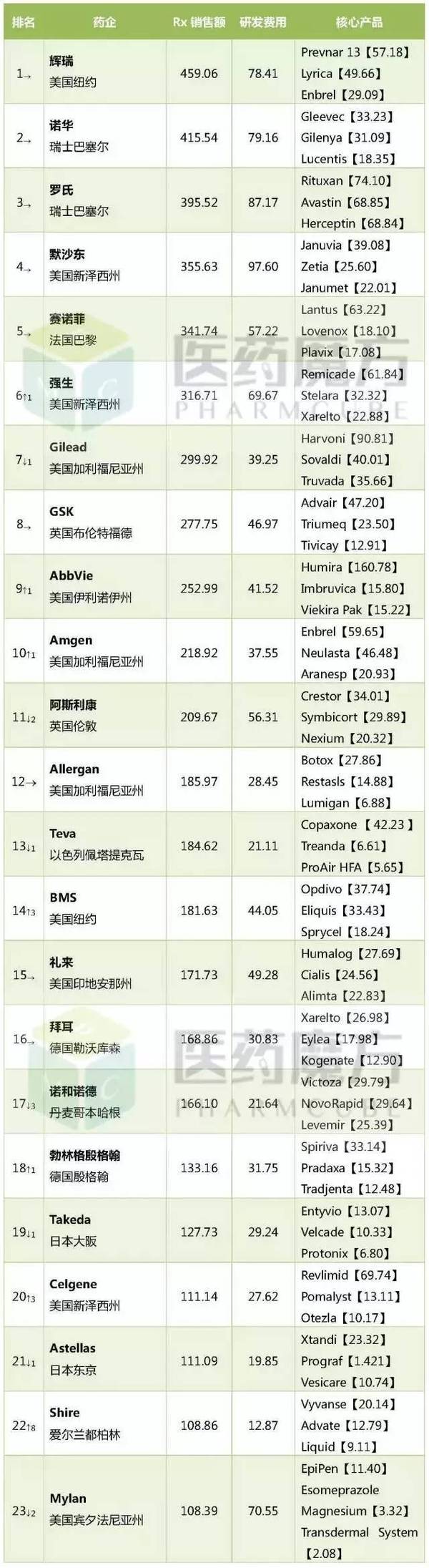 2017年的排名相比2016年整体变化不大,除了依靠并购整合的Shire、Endo制药排名有大的提升外,其他药企的排名都无太大意外,TOP5没有任何变化,辉瑞再度卫冕全球制药企业老大。