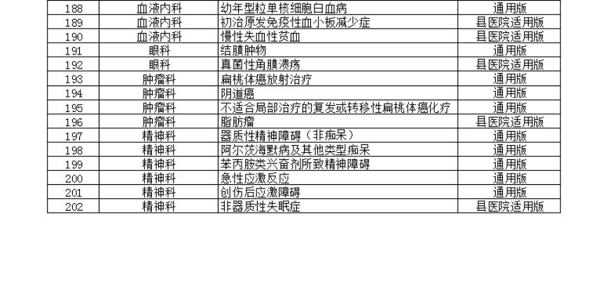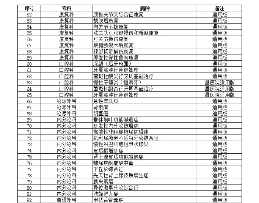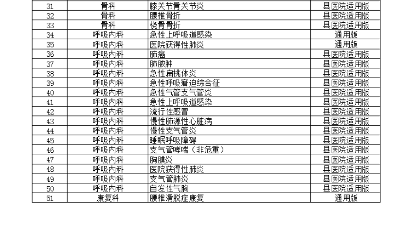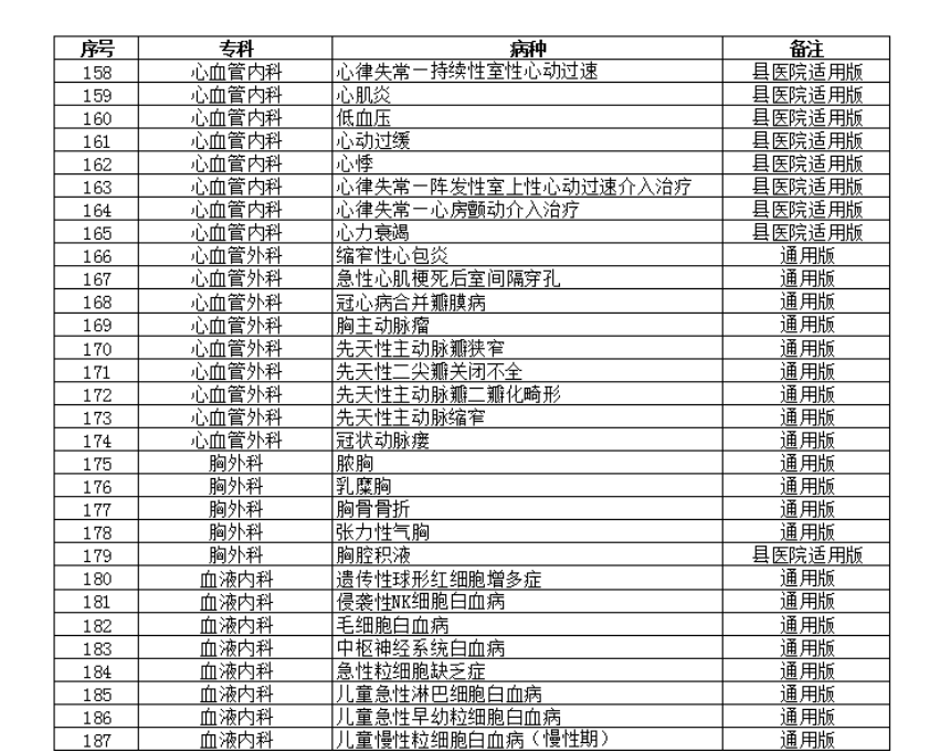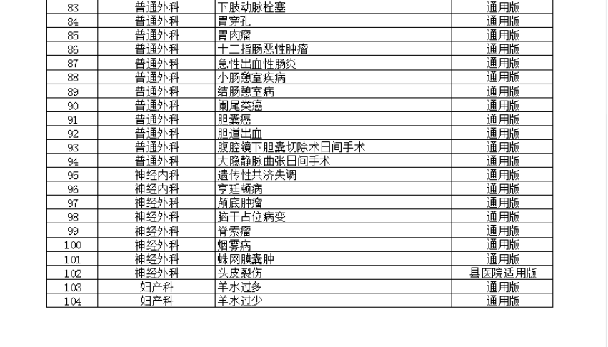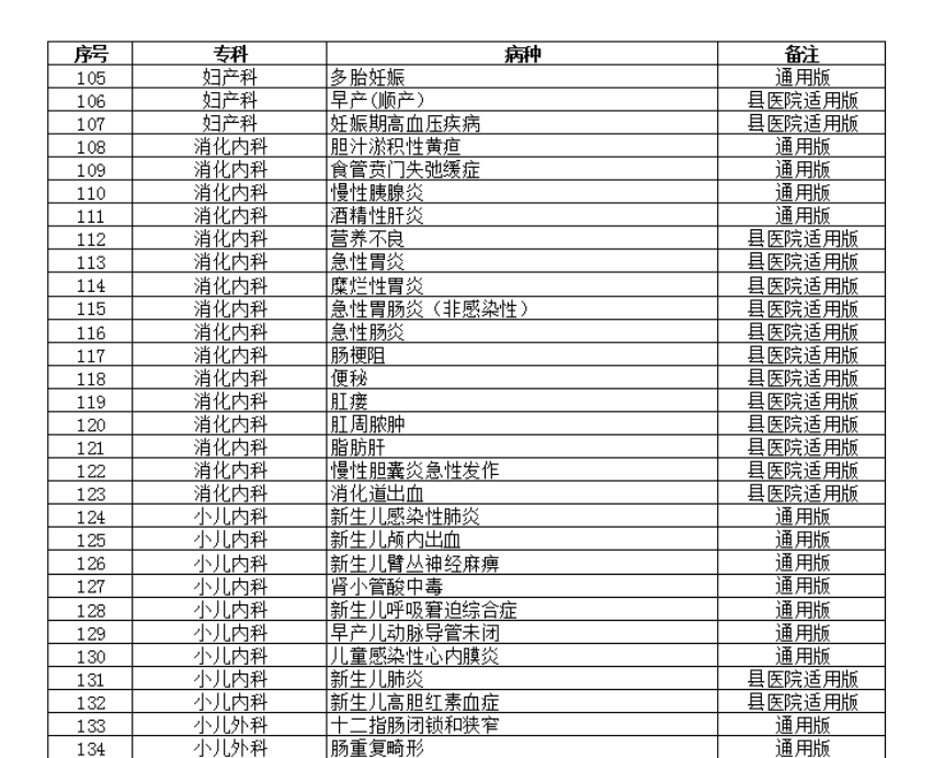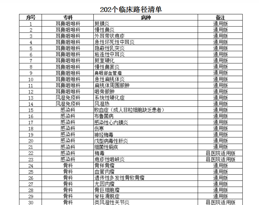 本次《通知》最新发布的23个专业202个病种的临床路径包括:耳鼻咽喉科12个、风湿免疫科2个、妇产科5个、感染科9个、骨科10个、呼吸内科17个、精神科6个、康复科9个、口腔科6个、泌尿外科3个、内分泌科13个、普外科13个、神经外科6个、神经内科2个、消化科16个、小儿内科9个、小儿外科11个、心内科22个、胸外科5个、血管外科9个、血液科11个、眼科2个、肿瘤科4个。