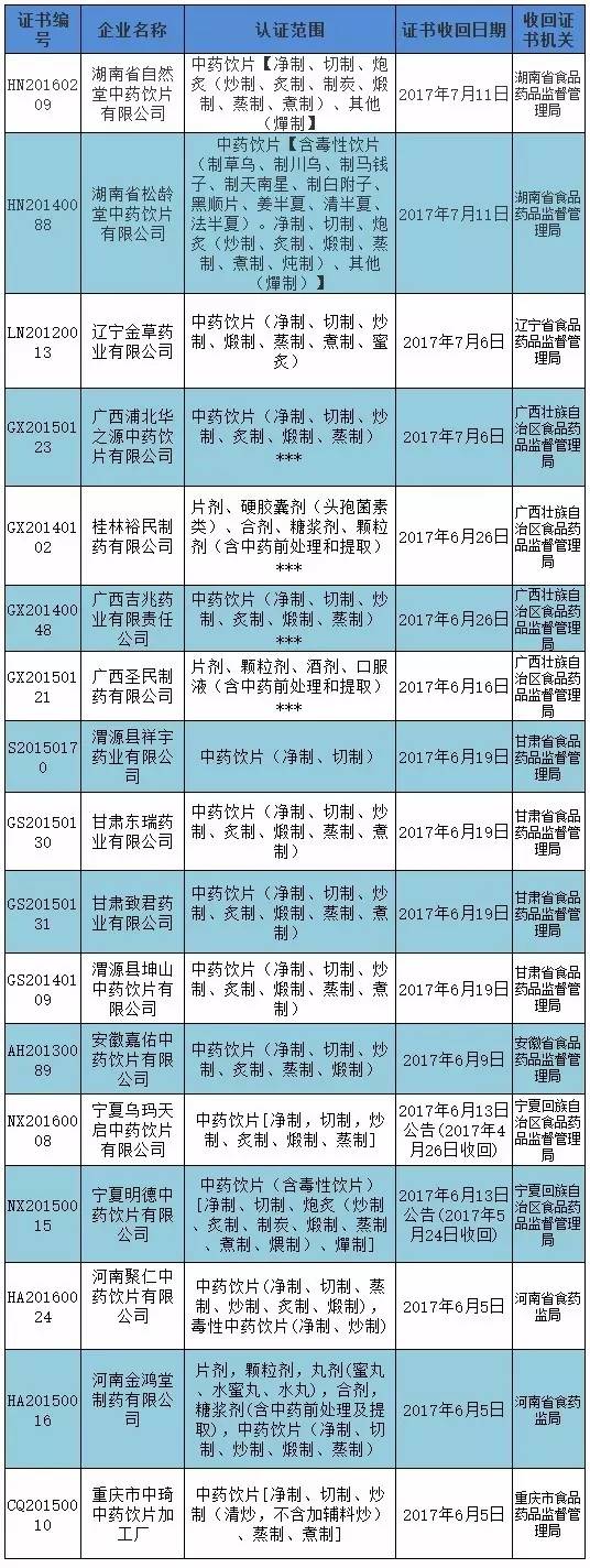 据统计,6月份至今,各省食药监局共计收回17张GMP证书,有16张是中药饮片企业。