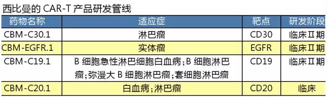 西比曼生物科技于2014年在美国纳斯达克挂牌上市,成为第一个在美国纳斯达克上市的中国细胞生物医药科技公司。西比曼的CAR-T临床研究主要与解放军301医院韩为东教授合作,2015年2月以1200万收购了解放军总医院(301医院)韩为东教授组的4项CAR-T产品,并保留后续产品的优先收购权。