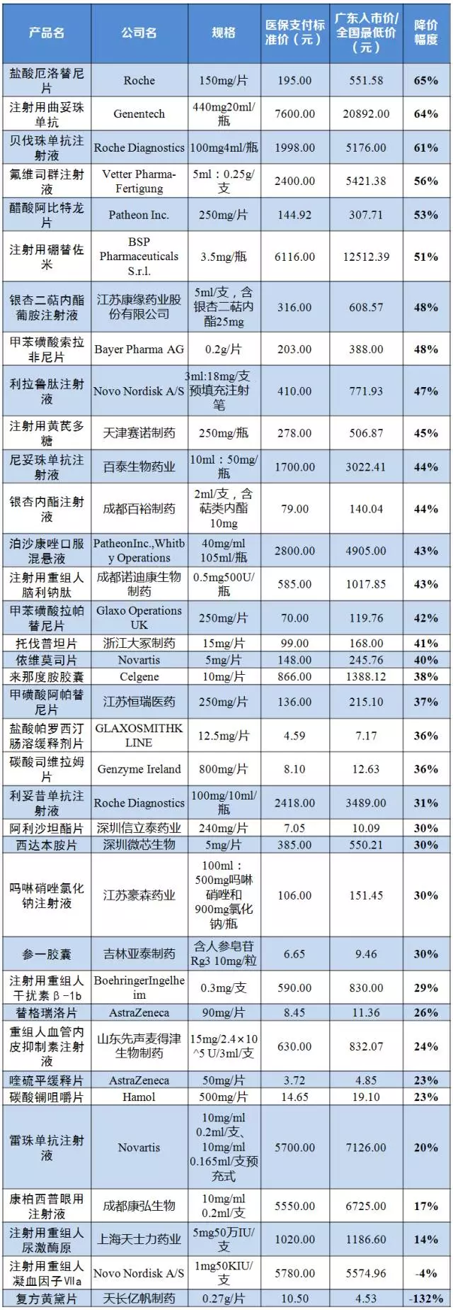 2015年卫计委3个谈判药品替诺福韦二吡呋酯、埃克替尼、吉非替尼降价幅度分别为67%、54%、55%。据人社部介绍,与2016年平均零售价相比,36个谈判药品的平均降幅达到44%,最高的达到70%,大部分进口药品谈判后的支付标准低于周边国际市场价格。