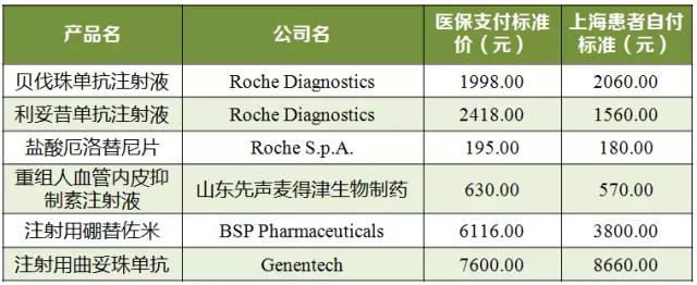 表2医保支付标准和上海患者自负标准比较