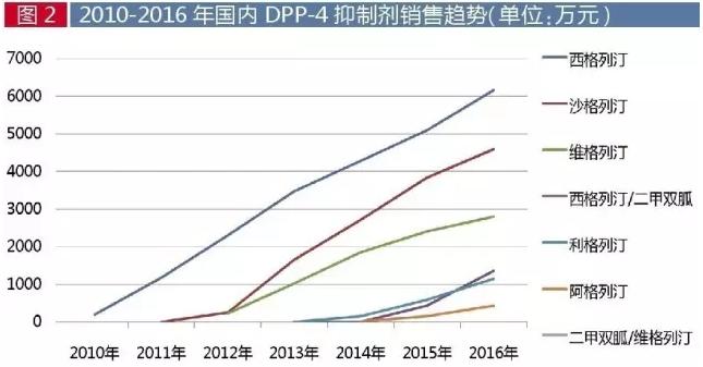 据国内样本医院数据统计,2016年样本医院DPP-4抑制剂销售额为1.7亿元。其中西格列汀销售额6161万元、沙格列汀销售额4598万元、维格列汀销售额2798万元、利格列汀销售额1149万元、阿格列汀销售额438万元;西格列汀/二甲双胍销售额1355万元、二甲双胍/维格列汀销售额35万元。排名前三位产品西格列汀、沙格列汀、维格列汀较同期增长率分别为20.9%、19.8%和16.6%。值得注意的是,西格列汀/二甲双胍较同期增长率为214.6%。西格列汀、沙格列汀在DPP-4抑制剂市场中占据了较大的份额,其它产品较同期也都保持较高的增长速度。