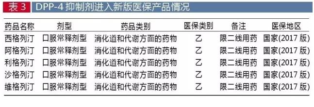 今年3月21日,人社部公布了2017年版《国家基本医疗保险、工伤保险和生育保险药品目录》,备受瞩目的DPP-4抑制剂有5个产品进入新版医保目录,分别是西格列汀、阿格列汀、利格列汀、沙格列汀、维格列汀口服常释剂型,医保类别为乙类,限二线用药。