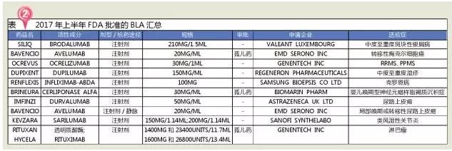 从治疗领域来看,2017年上半年FDA批准的BLA主要包括4个抗肿瘤药、2个抗炎药、2个神经系统用药和1个消化系统用药。