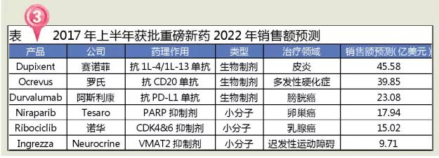 根据EvaluatePharma对2022年药品销售的预测数据,2017年上半年FDA批准的多个药品将有希望成为重磅新药,其中治疗皮炎的Dupixent、治疗多发性硬化症的Ocrevus和治疗膀胱癌的Durvalumab等生物制剂有望突破20亿销售额大关。