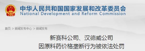 7月31日,国家发改委官网发布《新赛科公司、汉德威公司因原料药价格垄断行为被依法处罚》的新闻。
