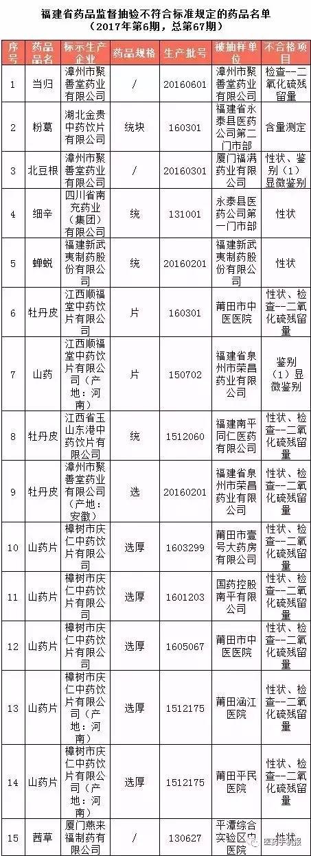 7月31日,福建省药监局发布2017年第6期(总第67期)药品质量公告,本次抽验发现15批次药品不符合标准规定。