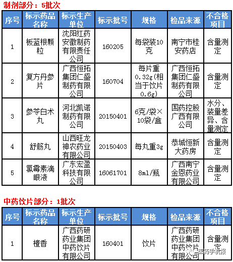 8月2日,广西壮族自治区药监局发布2017年第6期(总第47期)药品质量公告,经核查确认,对抽验不符合标准规定的5批次药品制剂和1批次中药饮片予以公告。