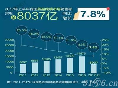 从2011-2016年,中国药品市场终端销售额由8097亿元上升至14975亿元,6年复合增长率达到13.08%。