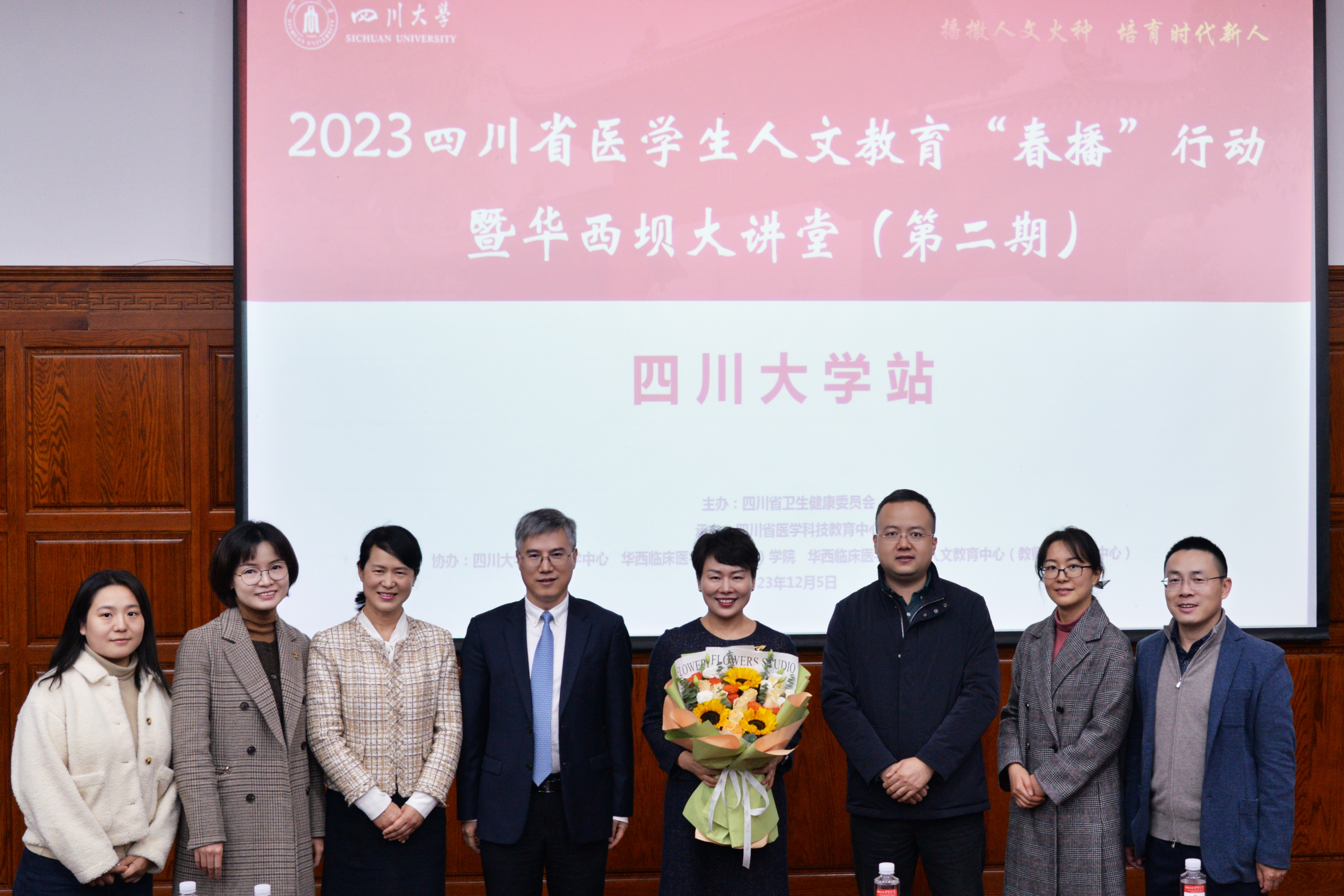12月5日下午,2023年四川省医学生人文教育“春播”行动暨华西坝大讲堂(第二期)在华西校西区启德堂133教室盛大开幕。医学生人文教育“春播”行动由四川省卫生健康委员会发起,省医学科技教育中心承办,以“播撒人文火种,培育时代新人”为主题,通过邀请医学领域的专家分享从医之路的经验与智慧,引导广大医学生树立敬佑生命、救死扶伤、甘于奉献、大爱无疆的职业精神。本次活动是“春播”行动的四川大学站,由华西医学中心联合我院医学人文教育中心(教师教学发展中心)、护理学院面向校内医学生展开。出席活动现场的嘉宾包括省卫健委科教处二级主任科员陈丹老师、省医学科技教育中心继教部刘莹部长、华西医学中心孙建勋副主任、我院罗凤鸣常务副书记、护理部蒋艳主任、护理学院张凤英副院长,以及医学人文教育中心(教师教学发展中心)副主任/期刊社党支部书记、社长杜亮教授等,他们与华西医学各学院的学生代表近130人共同分享了这场医文盛宴。活动由我院2020级护理学专业本科生于芷若同学担任主持。