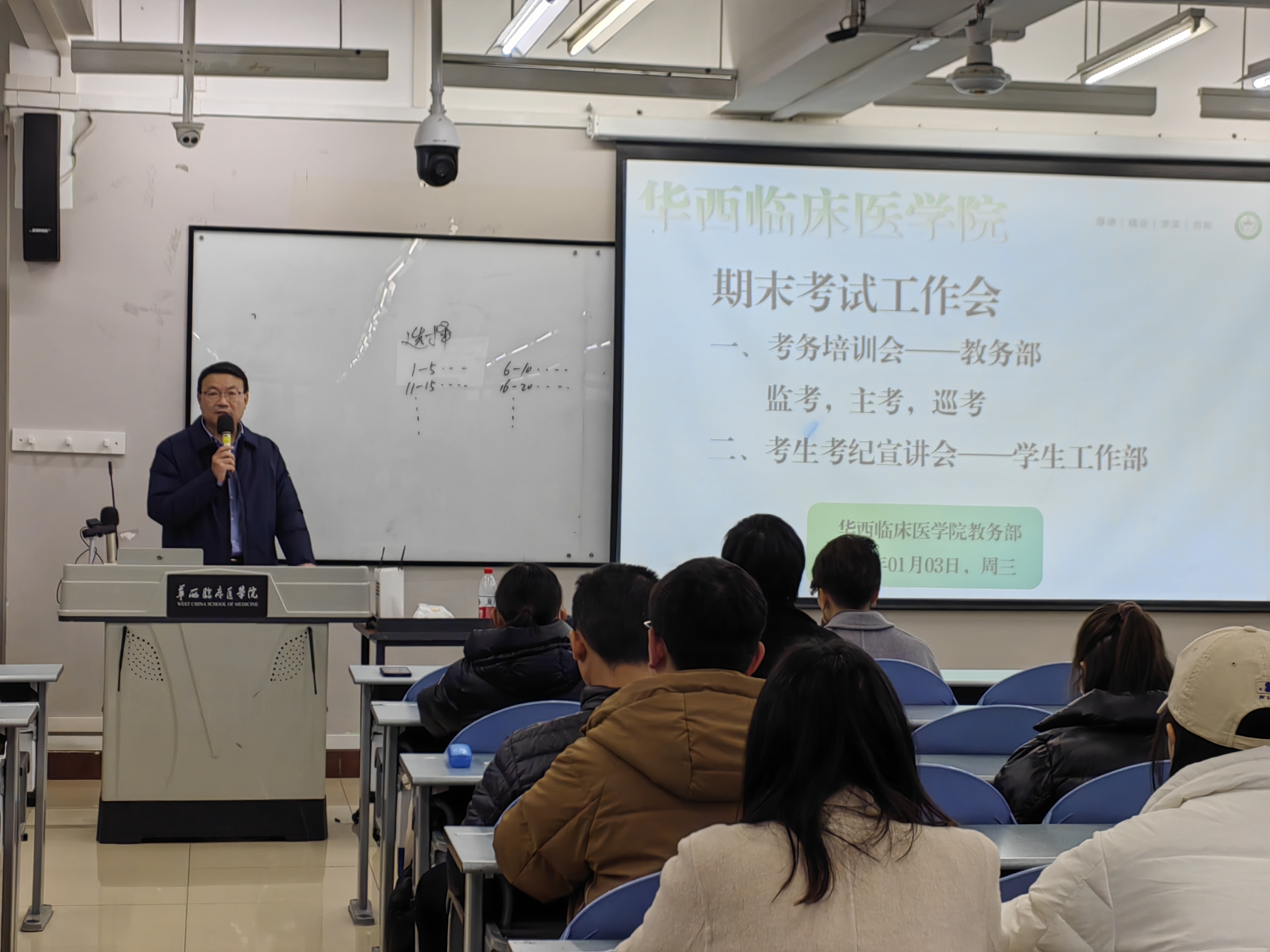 1月3日,教务部在临医楼201教室组织召开了2023-2024学年秋季学期期末考试考务培训会。华西临床医学院教学副院长王坤杰、护理学院院长李卡、医学技术学院执行院长李真林、教务部部长薛晖,以及来自全院各系/教研室约178名老师参加了本次培训会。