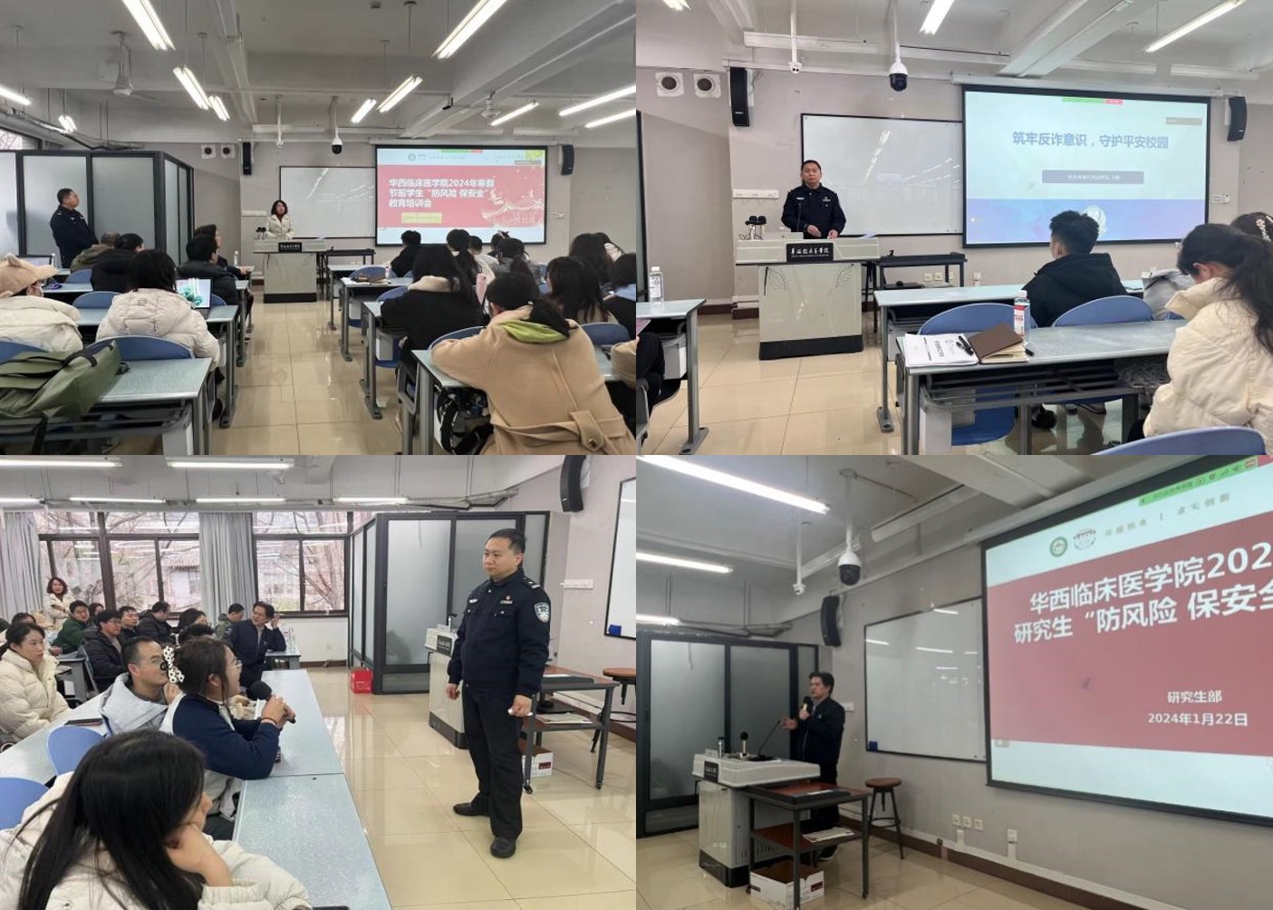 为防范各类诈骗,避免财产损失,守护平安校园,学院于1月22日下午在厚德楼201教室举办了2024年寒假节前学生“防风险 保安全”教育培训会,本次培训邀请了武侯公安局分局王竣警官来院分享。研究生部苏白海部长、学生工作部张猎部长及研究生部辅导员老师参加了本次培训,本次培训面向全院研究生、本科生和规范化培训学员,培训会现场约240余名同学参会,其余同学通过线上的方式参加本次培训会学习。