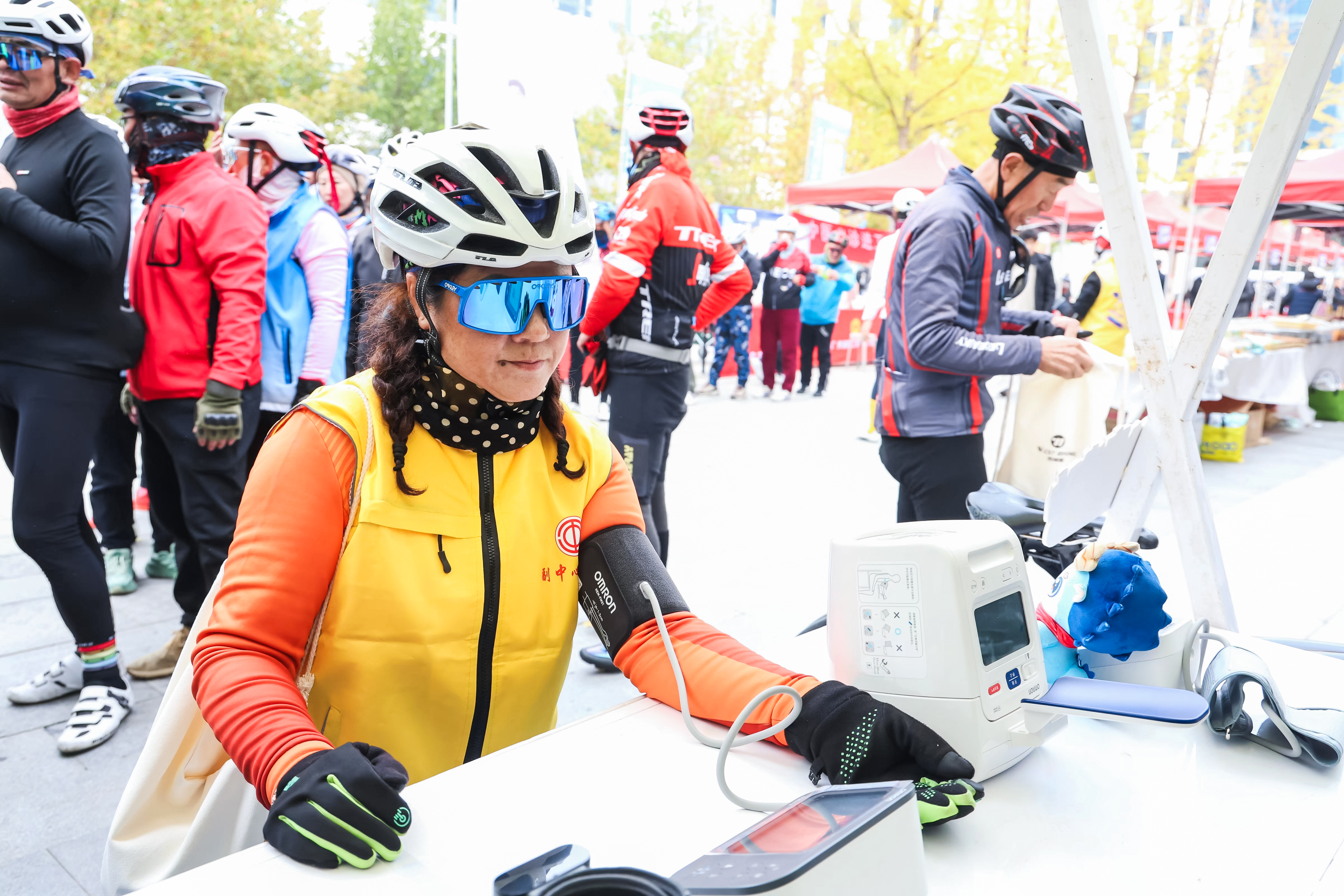 活动当天,通明湖畔秋色宜人,在互动区的欧姆龙健康体验展台前,多款智能健康产品有序陈列,吸引市民与骑友驻足体验及咨询交流。一旁的趣味互动区与主题打卡墙成为人气焦点,骑友们在此定格活力瞬间,让健康理念在轻松的氛围中自然传递。