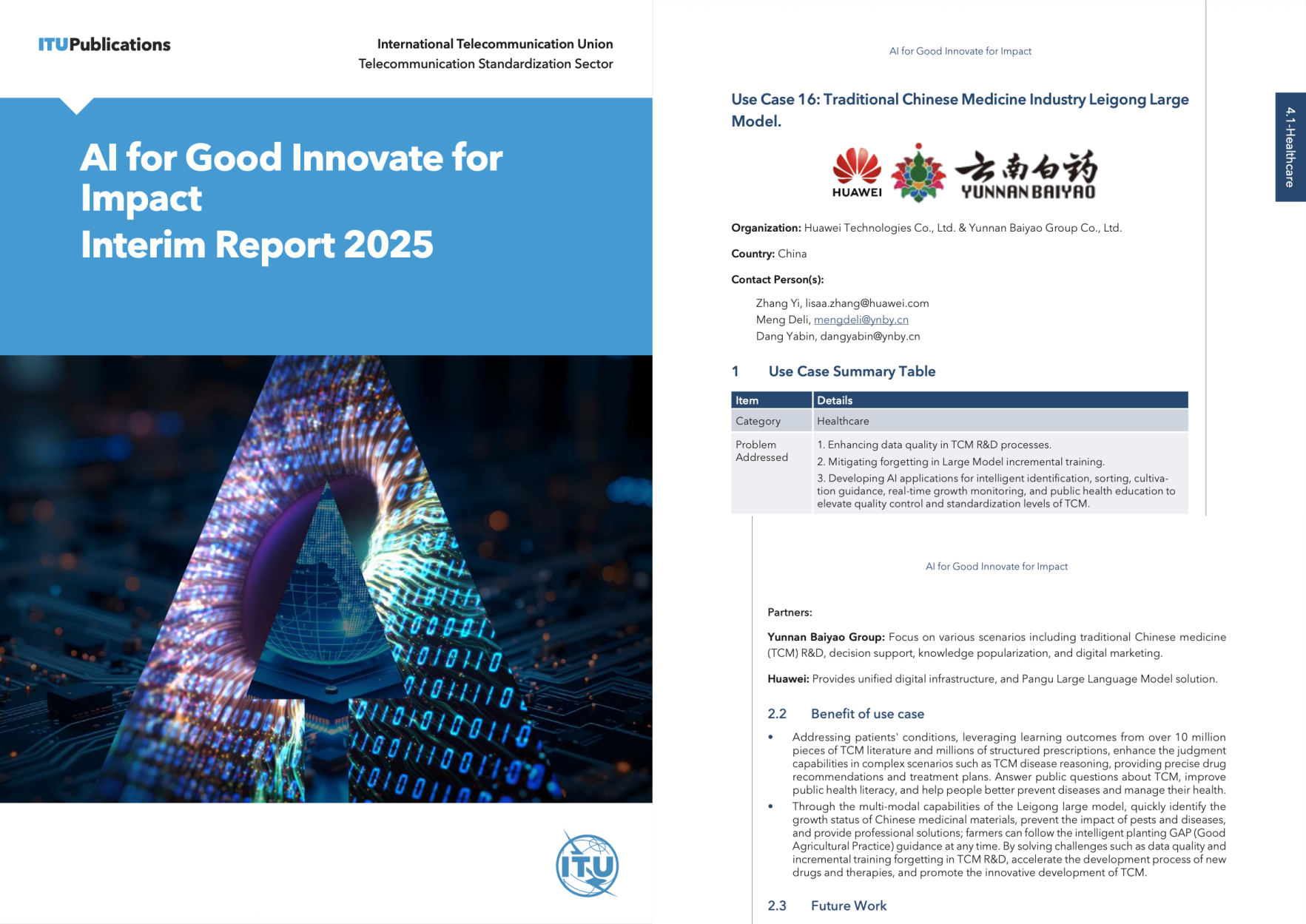 峰会期间,备受瞩目的《AI For Good-Innovate for Impact》全球案例集重磅发布。从中国、俄罗斯、瑞士、澳大利亚、意大利、印度等32个国家共234份案例中,遴选具有代表性的标杆案例。云南白药与华为联合申报的“ Traditional Chinese Medicine Industry Leigong Large Model”(中医药行业雷公大模型)凭借其显著的技术创新和赋能行业价值成功入选。不仅是中医药行业智能化转型的首个国际范例,也为全球产业升级提供了可借鉴、可复制的“中国方案”。同期入选的中国案例包括华为、阿里巴巴、百度、中国电信、中国移动、长安汽车等头部企业和机构,覆盖医药、金融、适老化等多个领域,彰显“技术向善”的全球共识。