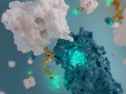 就像一个可以接收和发射无线电波的双向无线电一样,科学家设计了一种长5nm的荧光纳米天线。它可以接收一种颜色的光,并根据所感知的蛋白质运动,以另一种颜色反射回来,最后被检测到。纳米天线的主要创新之一是天线的接收器部分(下图亮绿色),可通过感应分子间相互作用,来研究蛋白质的分子表面。